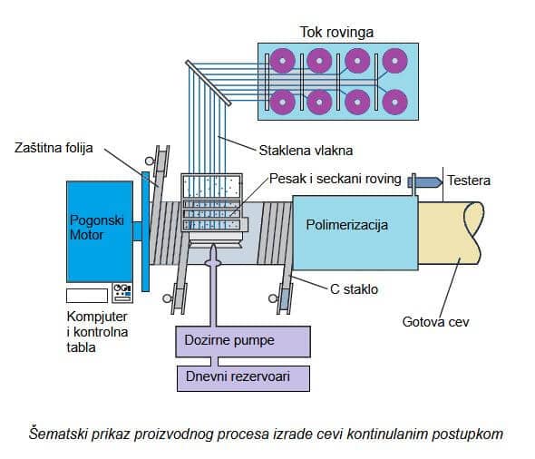 Posedujemo savremene mašine i opremu za kontinualni postupak proizvodnje cevi i spojnica uz elektronsko doziranje materijala i praćenje procesa proizvodnje. Optimalno očvršćavanje materijala potpomaže induktivno zagrejano čelično jezgro sa unutrašnje strane, egzotermna reakcija polimerizacije i infracrveno zračenje spolja. Isti princip izrade cevi je i kod izrade cevi za sve namene.